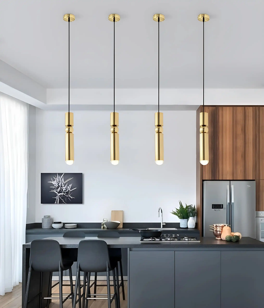 Shimmer and shine with metallic lighting finishes that harmonize with your kitchen’s other accents. It’s all about creating a rhythmic flow that’s both luxurious and understated. (Metallic lamp in this picture)