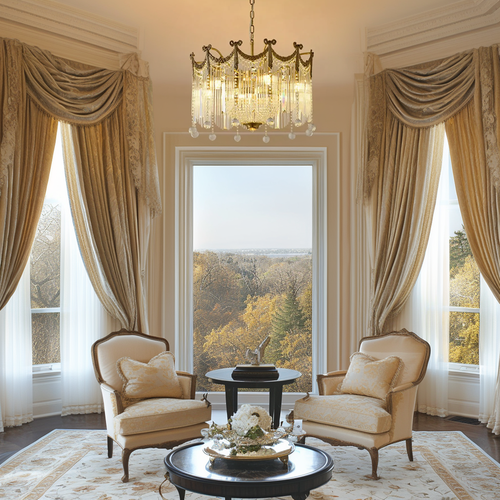 Don’t overlook the role of window treatments. Sheer, light curtains enhance the sparkle of crystal chandeliers, while heavy drapes lend gravitas to ornate fixtures.