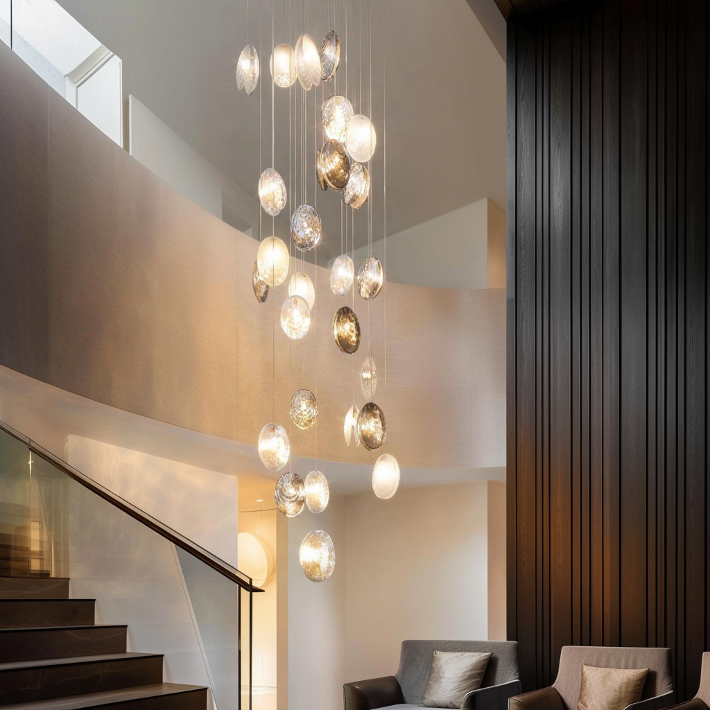 Large rooms benefit from tiered or oversized fixtures, while smaller spaces shine with minimalist designs.