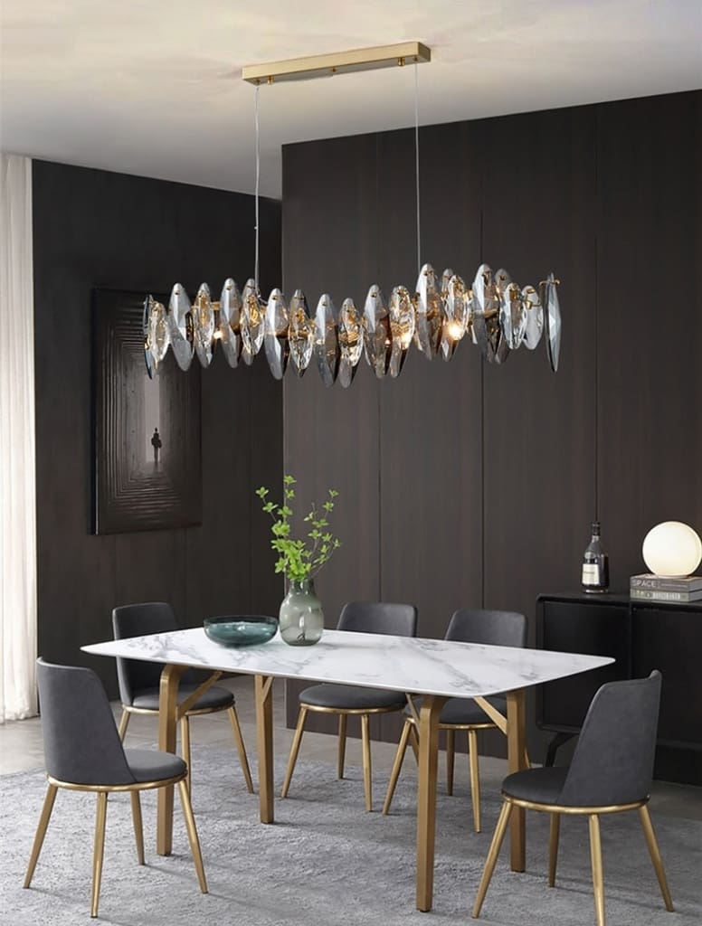 Now consider the length of the table. The chandelier’s length should be a minimum of 12 inches less than the table. For example, a 96-inch table can theoretically handle a chandelier up to 84 inches long. But for longer tables, two smaller chandeliers may work better.
